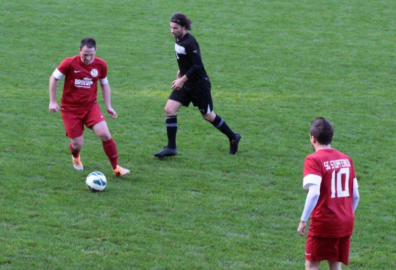 Die erste Möglichkeit des Spiels hatte Dominik Stoll für die Gastgeber, als nach zehn Minuten im Anschluß an einen Eckball sein Volleyschuß über das Tor abgefälscht wurde. In der 25. Minute setzte sich Marco Schäfer, der am heutigen Tage etwas offensiver ausgerichtet war, auf der rechten Seite durch. Sein Paß vor das Rüppurrer Tor erreichte Spielertrainer Timo Penzinger, der zum 1:0 erfolgreich war. Die letzten Minuten vor der Halbzeit hatten es in sich. Zunächst ging nach einer schönen Kombination der SG Stolls Schuß nur knapp über das Tor. Zwei Minuten später profitierten die Gäste von einem Ballverlust der Stupfericher im Mittelfeld. Ibrahim Aydin konnte mit der ersten Chance der Gäste den 1:1 - Ausgleich erzielen. Aber unmittelbar nach Wiederanstoß konnten die Stupfericher wieder in Führung gehen. Daniel Gartner legte an der Strafraumgrenze für seinen Sturmpartner Schäfer auf, der zum 2:1 erfolgreich war.