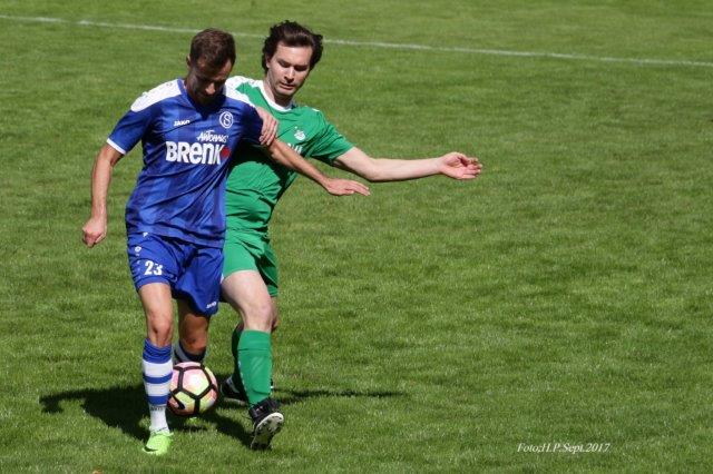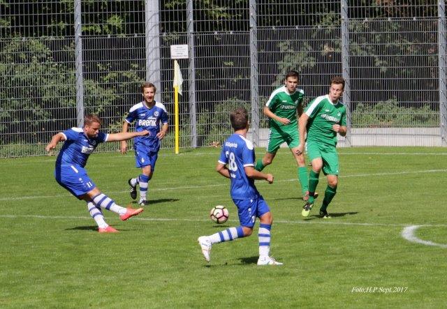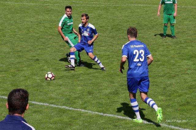 Bereits nach sieben Minuten ging die SG mit 1:0 in Führung. Michael Eldracher hatte den Ball für Luca Steinke aufgelegt. Dieser schoß von der Strafraumgrenze. Der Ball setzte auf, und TSV - Torhüter Niklas Bittmann hatte das Nachsehen. In der ersten halben Stunde konnten die Gäste die Partie einigermaßen offen gestalten. In der 29. Minuten wurde Nicolai Schiebenes auf der rechten Seite freigespielt und ließ mit seinem Schuß in's lange Eck Sebastian Graff im Tor der SG keine Abwehrmöglichkeit. Doch bereits die nächste Aktion der SG brachte die erneute Führung. Nach Vorarbeit von Nevis Ekic und Steinke traf Luca Vielsäcker, der an diesem Tage sein Debüt in der SG II gab. Drei Minuten später nahm Bittmann einen Rückpaß mit der Hand auf - korrekte Entscheidung von Schiedsrichter Oemke: indirekter Freistoß am Schöllbronner Fünfmeterraum. Steinke legte auf, und Ekic traf durch die Mauer zum 3:1 - Pausenstand.